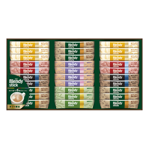 〈ブレンディ(R)スティック〉カフェオレ×9、カフェオレ ミルクたっぷり×6、カフェオレ 甘さなし・紅茶オレ・ヘーゼルナッツオレ 各4、抹茶オレ×3